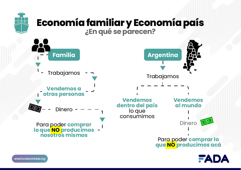 “En nuestra familia trabajamos y vendemos nuestros productos o servicios a otros para obtener dinero que usamos para comprar lo que necesitamos y no podemos producir por nuestra cuenta. Si lo vemos a nivel Argentina pasa lo mismo: cada uno de los argentinos trabajamos y vendemos tanto dentro del país para consumo interno como también a otros países para que ingresen dólares que necesitamos para comprar aquello que no hacemos como celulares, ropa, partes de autos, computadoras, Netflix, HBO, etc.”, explicó Nicolle Pisani Claro, economista de FADA.