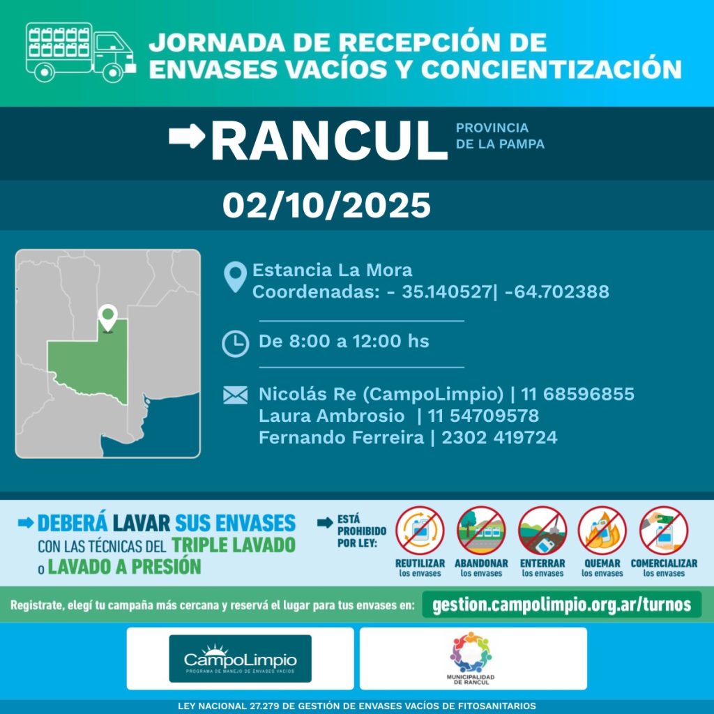 Así comenzará la agenda del nuevo mes, con la recepción de los recipientes en la localidad norteña, en un trabajo conjunto entre el municipio de Rancul y la asociación CampoLimpio.