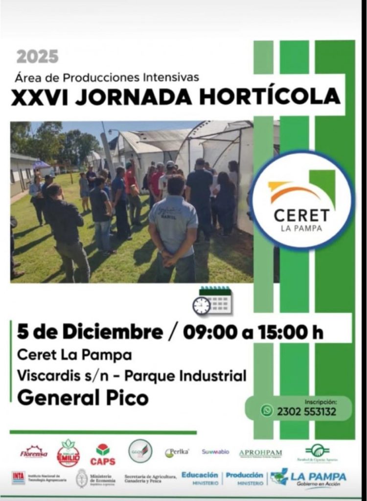 El área de Producciones Intensivas del CERET invitó a participar de la XXVI Jornada Hortícola, a realizarse este vienres 5, de 9 a 15, en las instalaciones del Centro Regional de Educación Tecnológica, en el Parque Industrial de General Pico.