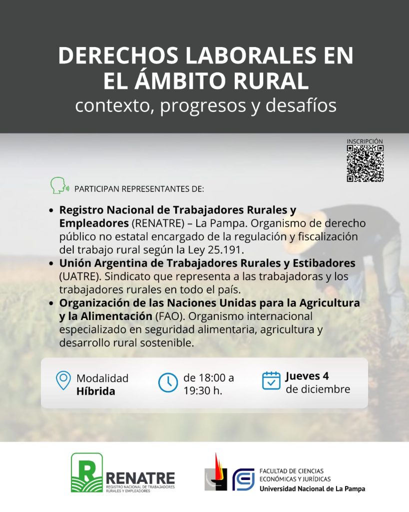 Para conocer más acerca del contexto, progresos y desafíos en de los derechos laborales en el ámbito rural, se realizará este jueves 4 de diciembre una jornada abierta, gratuita y de modalidad híbrida en coordinación entre RENATRE, Facultad de Ciencias Económicas y Jurídicas (UNLPam) y UATRE.