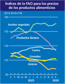 » El índice de precios de los cereales de la FAO registró en enero un promedio de 107,5 puntos, lo que supone una subida marginal de 0,2 puntos (un 0,2 %) con respecto a diciembre, si bien permanece 4,4 puntos (un 3,9 %) por debajo del nivel alcanzado el año anterior. Los precios mundiales del trigo se mantuvieron mayormente estables en enero, con un descenso de apenas el 0,4 % en comparación con diciembre. Los precios internacionales del maíz también siguieron la tendencia a la baja, con una reducción del 0,2 % respecto de diciembre. En cuanto a otros cereales secundarios, los precios mundiales de la cebada registraron un modesto incremento, respaldados por la gran demanda de suministros argentinos, mientras que los precios del sorgo reflejaron los movimientos del mercado del trigo y fueron objeto de un ligero descenso. Por el contrario, el índice de precios de la FAO para todos los tipos de arroz aumentó un 1,8 % en enero de 2026, como resultado de la mayor demanda, en especial de variedades aromáticas.