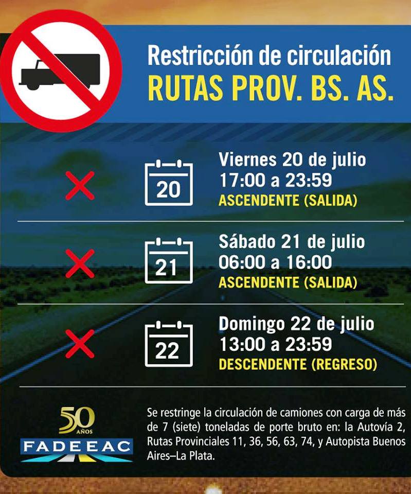 Por disposición de la Dirección de Vialidad Provincial, hoy viernes 20, el sábado 21 y el domingo 22 de julio habrá restricción de circulación de vehículos con carga de más de siete toneladas en Rutas Provinciales, Autovía 2 y la Autopista Buenos Aires -La Plata.