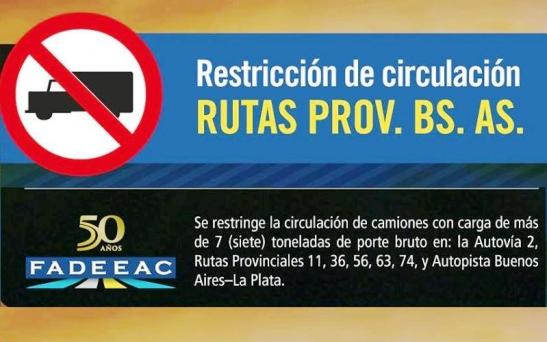 La Fadeeac informó de la restricción a la circulación que afectará la Autovía 2, Rutas Provinciales 11, 36, 56, 63, 74 y la autopista Buenos Aires- La Plata hasta el próximo lunes.
