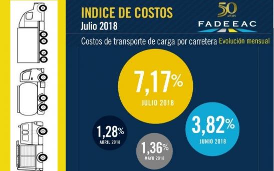 Un preocupante aumento del 7.17%, la suba mensual más alta desde marzo de 2016, fue el que registró el transporte de mercadería por carreteras en julio de 2018, según graficó el Índice de Costos de la Federación Argentina de Entidades Empresarias del Autotransporte de Cargas (FADEEAC). El incremento en los últimos doce meses es superior al 37%, lo que deja sin aire al sector.