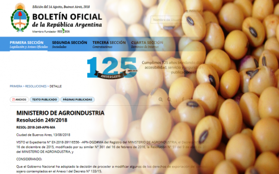 “Que el Gobierno Nacional ha adoptado la decisión de proceder a modificar algunos de los derechos de exportación del complejo sojero contemplados en el Anexo I del Decreto N° 133/15”, indicó la resolución publicada hoy que agrega “la suspensión temporaria del Registro de Declaraciones Juradas de Venta al Exterior (DJVE) de dichos productos”.