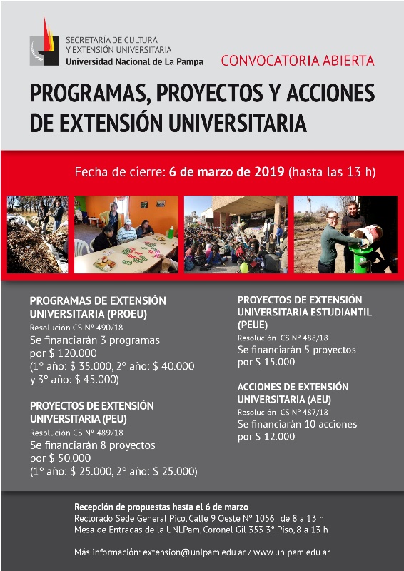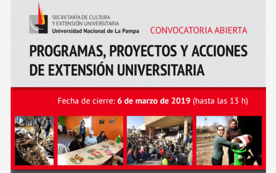 La Secretaría de Cultura y Extensión abrió la Convocatoria 2018 para la presentación de Programas, Proyectos y Acciones de Extensión Universitaria. Las propuestas aprobadas comenzarán a ejecutarse en abril de 2019.