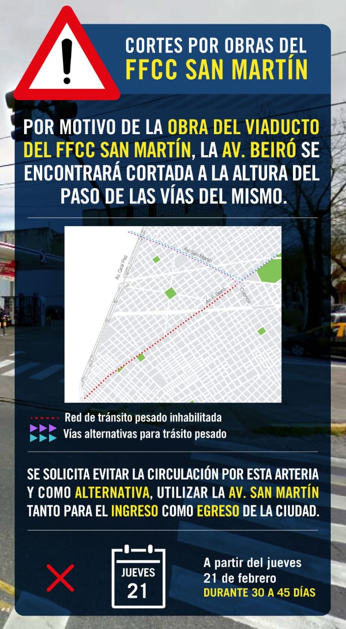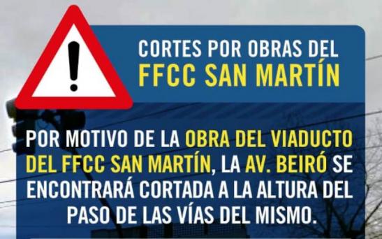 Por la obra del viaducto del ferrocarril San Martín la avenida Beiró se encontrará cerrada desde mañana a la altura del paso de las vías. Este corte significa una inhabilitación al tránsito pesado.
