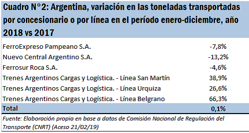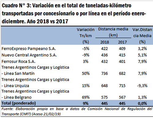 En relación a las toneladas-kilómetro (que es la multiplicación de las toneladas transportadas por la distancia media) en el 2018 respecto del 2017 se observó un aumento en Ferrosur Roca (+3%), y las tres líneas operadas por el Estado: San Martín (+50%), Urquiza (+15%) y Belgrano (+69%). Cayeron FerroExpreso Pampeano y Nuevo Central Argentino.