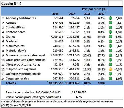 Finalmente, se incluye el Cuadro N° 4 que muestra las toneladas transportadas por el Sistema Ferroviario de Cargas de la República Argentina discriminado por familia de productos. Como puede apreciarse, los derivados del agro y la agroindustria (renglones 1; 2; 5; 6; 10; 11 y 12) fueron aproximadamente 11,2 millones de toneladas durante 2018, lo que representó el 60% de la carga transportada. Si a ese volumen transportado se lo multiplica por la tarifa media del sistema que informa la CNRT para el año 2018, de casi $ 413 por tonelada se obtiene un monto de facturación bruta anual estimado de unos 4.626 millones de pesos, originados por la actividad de esos sectores».