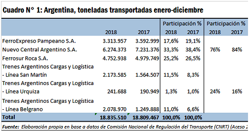 El tonelaje transportado por ferrocarril en 2018 alcanzó las 18,8 millones de toneladas. Como puede apreciarse en el Cuadro N° 1, la participación de cada una de las empresas concesionarias del servicio, FerroExpreso Pampeano S.A.; Nuevo Central Argentino S.A. y Ferrosur Roca S.A., en ese total fue de 17,6%; 33,3% y 25,2%, respectivamente. En tanto, la participación de las líneas San Martín, Urquiza y Belgrano, que forman parte de Trenes Argentinos Cargas y Logística, fue de 11,5; 1,3% y 11,0%, respectivamente.