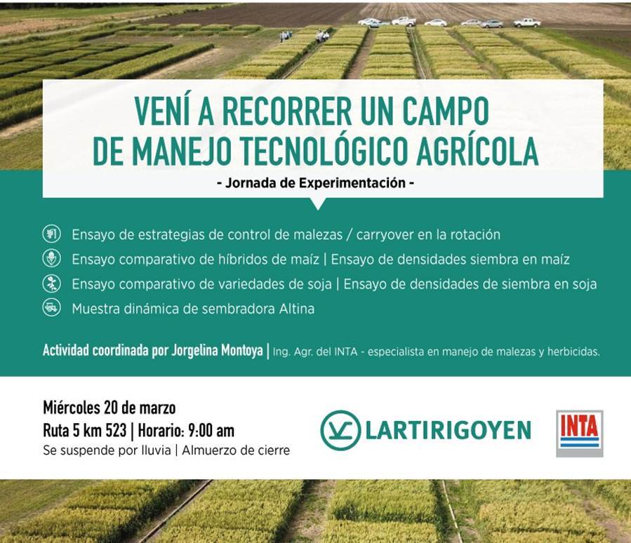 La jornada organizada por INTA y Lartirigoyen, no se suspende por lluvia y comenzará a las 9 para extenderse hasta después del almuerzo. En el lugar se mostrarán estrategias de control de malezas, ensayos de maíz y de soja y además habrá una dinámica con sembradora.