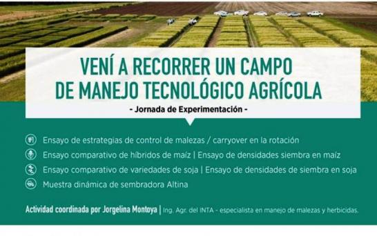 “Vení a recorrer un campo de manejo tecnológico agrícola”, es la invitación para la jornada que se realizará mañana de manera gratuita y abierta en la Ruta Provincial 5 kilómetro 523.
