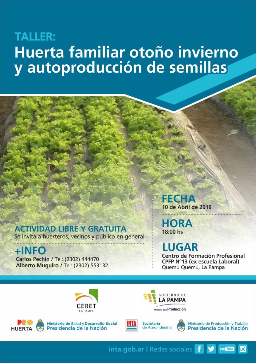 La actividad que llevarán a cabo con una jornada de capacitación, los ingenieros de INTA Alberto Muguiro y Carlos Pechín, comenzará a las 18 en la ex escuela laboral de la localidad. La entrada es libre y gratuita para huerteros, vecinos y público en general. Organizan Ceret, Gobierno de La Pampa e INTA ProHuerta.