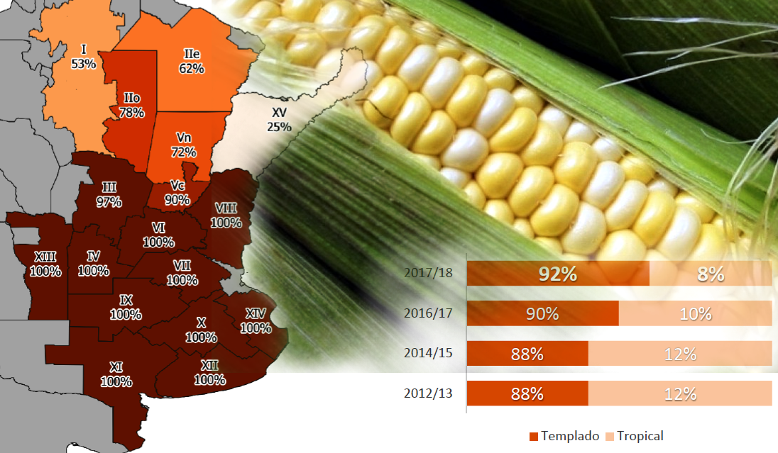 La participación de materiales de germoplasma templado representa un alto porcentaje a escala nacional. A lo largo de las últimas campañas, en regiones del norte el uso de estos ha crecido de manera notoria así como también el uso de materiales templado-tropical, en detrimento de tropicales.