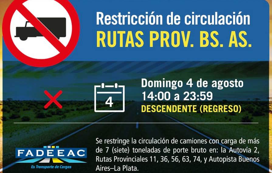 La Dirección de Vialidad de la Provincia de Buenos Aires comunicó las restricciones a la circulación de camiones con carga de más de 7 toneladas de porte bruto para el fin de semana.