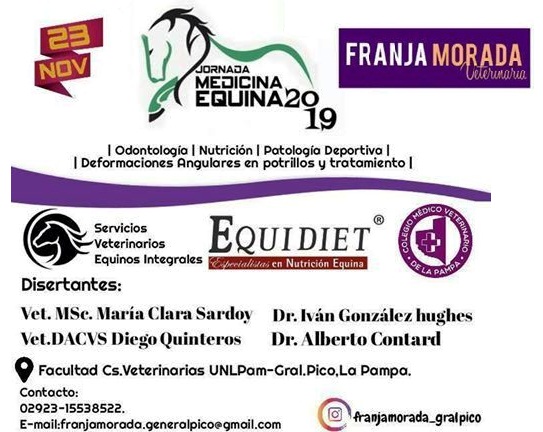 El 23 de noviembre se realiza la Jornada Equina 2019 en General Pico, una propuesta organizada por Franja Morada con apoyo del Colegio Médico Veterinario de La Pampa y entidades privadas. Con disertaciones que abarcarán temas de nutrición, patologías deportivas, odontología y cuidados del potrillo.