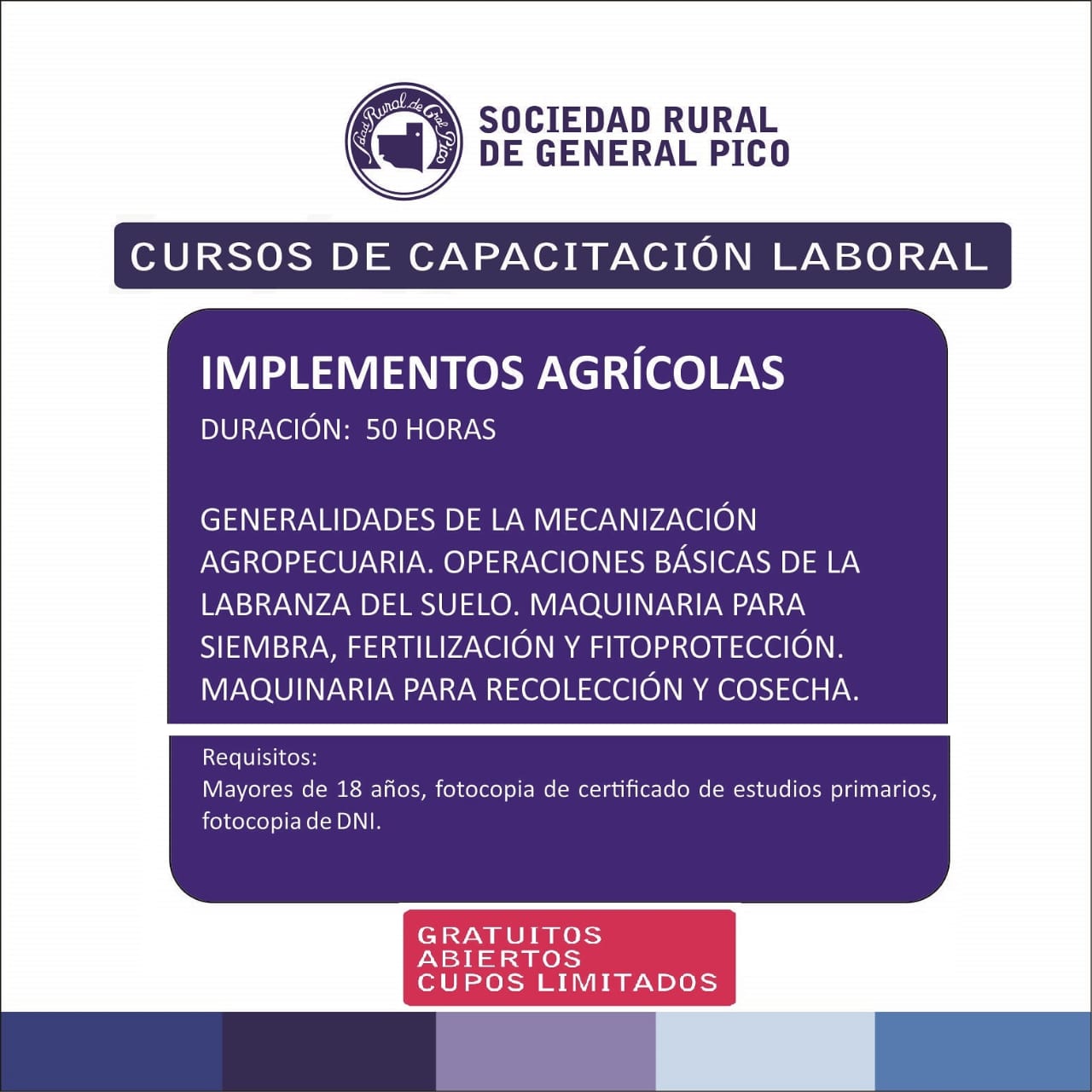 Una de las propuestas será Implementos Agrícolas, con una duración de 50 horas y destinada a capacitar sobre mecanización agropecuaria, operaciones básicas de la labranza del suelo, maquinaria para la siembra, fertilización y fitoprotección, recolección y cosecha.