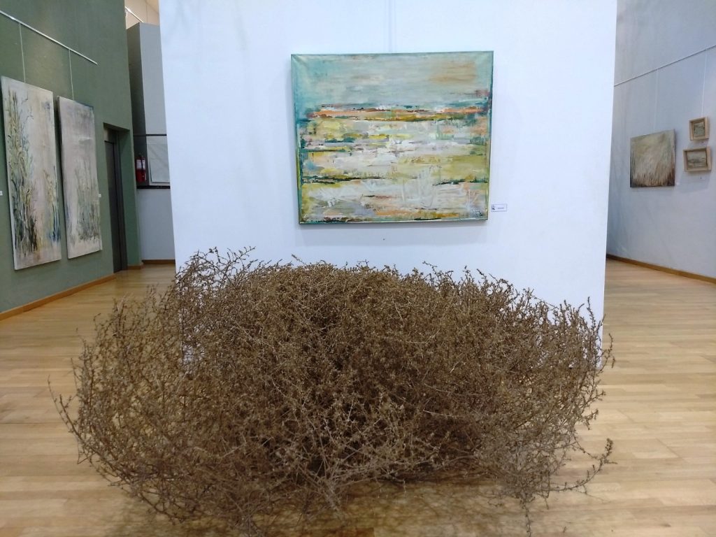 María José Pérez, artista visual, que comenzó a trabajar con la muestra hace más de un año y medio, inspirando cuadros y esculturas a partir de las características de La Pampa. “Empezaron a cobrar vida y mimetizarse con el paisaje”, explicó sobre las obras ambientadas con ramas, cardos y pastos nativos.
