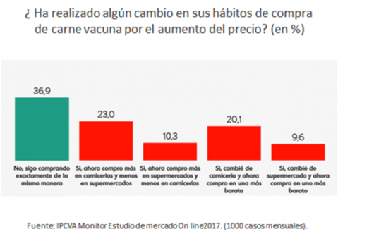 De acuerdo al “Monitor de Estudio de Mercado” que realiza el Instituto (un estudio de 1.000 casos mensuales on line), si bien un 36% de los encuestados asegura que ante el aumento de precios sigue comprando de la misma manera, un 23% sostiene que ahora compra más en carnicerías y menos en supermercados, un 10,3% asegura lo contrario (de la carnicería pasó a buscar las ofertas de los súper), un 20,1% cambió su carnicería de siempre por otra más barata, y un 9,6% elije otro supermercado más económico al que compraba antes.