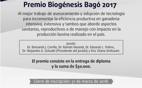 Junto a ANAV Academia Nacional de Agronomía el Consejo Profesional de Médicos Veterinarios, presentó el Premio Biogénesis Bagó 2017 al mejor trabajo de asesoramiento de tecnología para incrementar la eficiencia productiva en ganadería intensiva, extensiva y tambos.