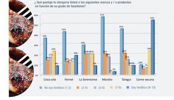 Entre los hallazgos llama poderosamente la atención que mientras un 54% de la gente se consi- dera “fanática” de la carne vacuna, un bajo porcentaje se considera de ese modo cuando se les pregunta por las demás marcas analizadas: Fernet (19%), Taragüi (9 %), La Serenísima (9 %), Coca Cola (9 %) y Marolio (3 %).