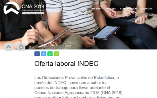 El sitio del censo: www.cna2018.indec.gob.ar pone a disposición de los interesados en participar la oferta laboral de las Direcciones Provinciales de Estadística. Y a través del INDEC, se convoca a cubrir los puestos de trabajo para llevar adelante el Censo Nacional Agropecuario 2018 (CNA 2018) que se realizará de septiembre a diciembre. La convocatoria está abierta para todos los puestos de trabajo de la estructura censal.