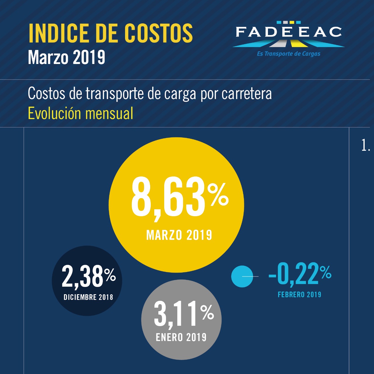 El Índice de Costos de Transporte elaborado por FADEEAC (Federación Argentina de Entidades Empresarias del Autotransporte de Cargas) volvió a exhibir en marzo de 2019 un fuerte incremento del 8.63 %.