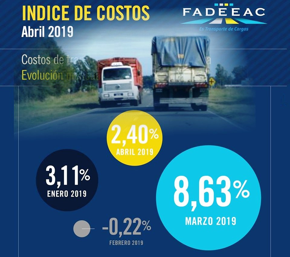 Con esta cifra se acumula un aumento de un 14.45% en el primer cuatrimestre de 2019, lo que implica la continuidad de la aceleración de la variación de los costos del transporte de carga en el país, que impacta sobre todo a partir de la segunda parte del 2018.