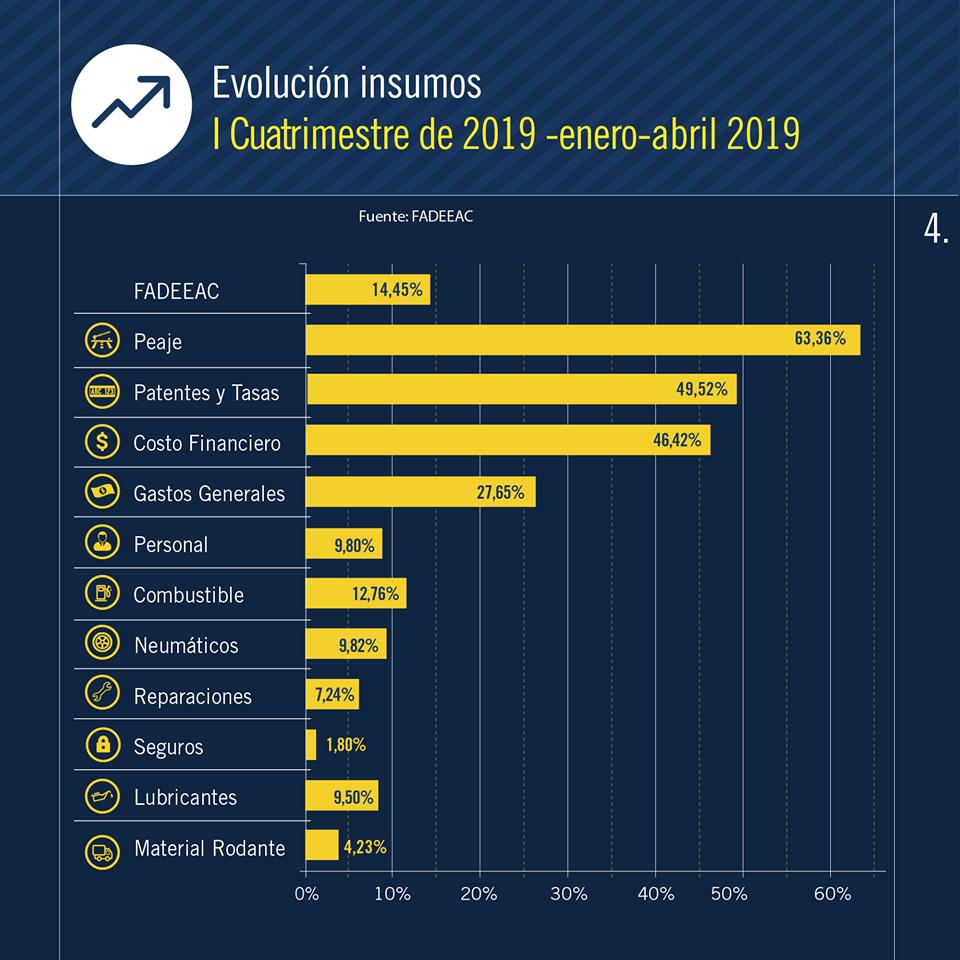 Finalmente, completan las variaciones de costos en abril, Gastos Generales (6.79%) y Peajes (1.10%), que continúa liderando los aumentos de costos en el autotransporte de cargas en el primer cuatrimestre del año, con 63% de suba -si se conjuga rutas nacionales y accesos-, tras haber aumentado 43.6 % en marzo pasado, y 68% en 2018.