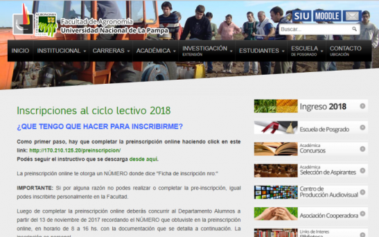 La Facultad de Agronomía informó que se encuentra abierta la inscripción de estudiantes interesados en iniciar alguna de sus carreras en el año 2018. El trámite podrá efectuar a través de una preinscripción en línea en www.agro.unlpam.edu.ar y en la sede de Ruta Nacional 35 kilómetro 334.