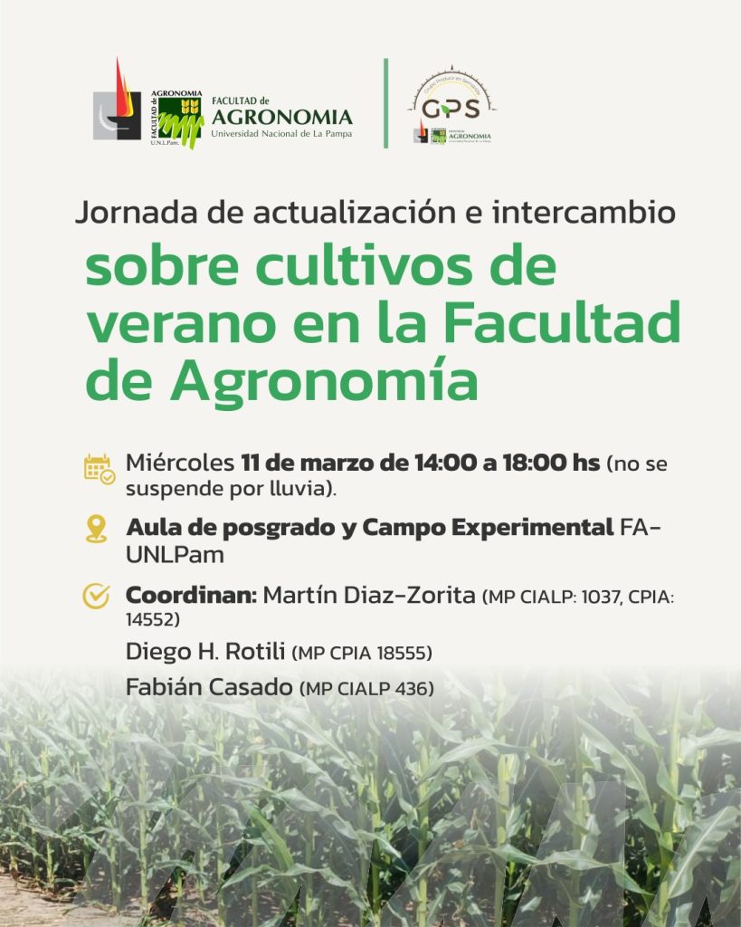 El 11 de marzo se hará en la Facultad de Agronomía de la UNLPam una jornada de actualización e intercambio sobre Cultivos de Verano. La actividad comenzará a las 14 horas y se extenderá durante la tarde hasta las 18 horas.