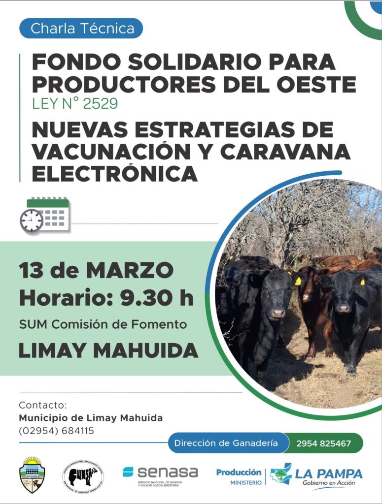 El Ministerio de la Producción junto a SENASA, Funsadu (Fundación de Sanidad Animal del departamento Utracán) y el Municipio de Limay Mahuida, convocan a esta charla técnica a realizarse el próximo 13 de marzo para productores oesteños.