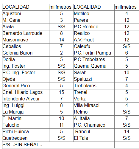 El registro de lluvias de 24 horas, que la policía tomó desde las 9 de la mañana de ayer hasta las 9 de la mañana de hoy, mostró que los registros fueron dispares en el norte pampeano. Con 15 milímetros Hilario Lagos tuvo el mayor acumulado, seguido por las localidades de Maisonnave y Rancul con 14. Entre 12 y 11 milímetros quedaron Parera, Realicó, Adolfo Van Praet y Falucho. El resto de las ciudades tuvieron menos de 10 milímetros, incluso General Pico que sólo registró en ese período cinco milímetros.