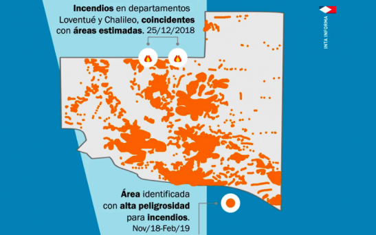 Pablo Vázquez –especialista en gestión ambiental y recursos naturales del INTA Anguil, La Pampa–, aseguró que hay 2.4 millones de hectáreas de alto peligrosidad para los incendios de la próxima temporada noviembre 2018-febrero 2019 y aseguró que, hasta el momento, la predictibilidad del modelo es cercana al 85 %.