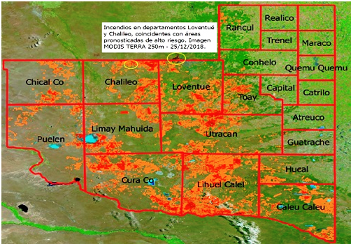 En este punto, confirmó que “se registran incendios importantes en los departamentos Loventué y Chalileo, ambos coinciden con las áreas estimadas como de alto riesgo”. En cuanto a las estimaciones, explicó que se debe a hay una importante región no incendiada en más de 10 años que se suma a un proceso de acumulación de forraje del último ciclo productivo y a áreas arbustadas de manera generalizada en la región.