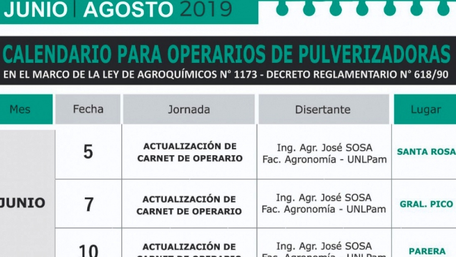 La Dirección de Agricultura de la Provincia informó que se realizarán jornadas destinadas a operarios de pulverizadoras en las localidades de Santa Rosa, General Pico y Parera.