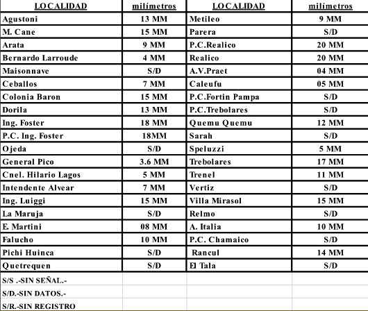 La lluvia del domingo en las localidades norteñas de La Pampa no llegó a reportar, según los datos de la URII de la policía, más de 20 milímetros en las localidades con mayor acumulación de agua. Con el mayor registro en Realicó.