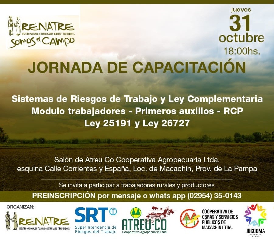 La delegación pampeana de Renatre invita a participar a trabajadores rurales y productores que quieran conocer más acerca de Sistemas de Riesgos de Trabajo y Ley Complementaria: Módulo trabajadores- Primeros Auxilios- RCP- Ley 25191 y Ley 26727.