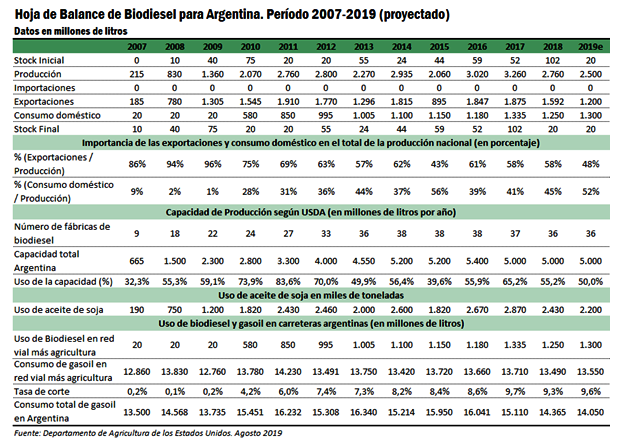 Gracias a la abundante oferta de materia prima, la ley de mezcla en gasoil B10 y la exitosa proyección exportadora, Argentina continúa siendo uno de los productores líderes de biodiesel a nivel mundial, aun cuando su industria opera al 50% de su capacidad instalada. Para 2019 el USDA estima una producción anual de biodiesel de 2.500 millones de litros, un 9,4% menos que en 2018, y muy por debajo del producto récord alcanzado en 2017 de 3.260 M lts.