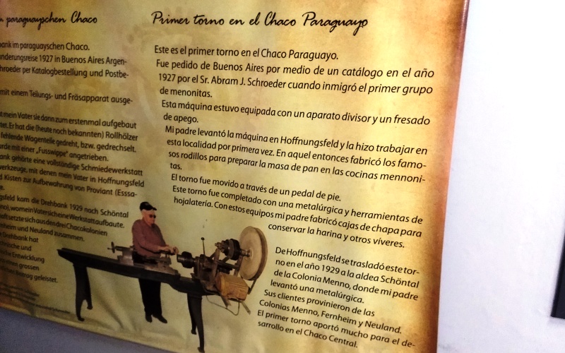 Fue Abram Schroeder, en 1927, quien encargó por catálogo desde Argentina cuando inmigró el primer grupo de menonitas a Paraguay. El torno a pedal fue usado como parte de los instrumentos para fabricar cajas de chapa para la industria harinera local.
