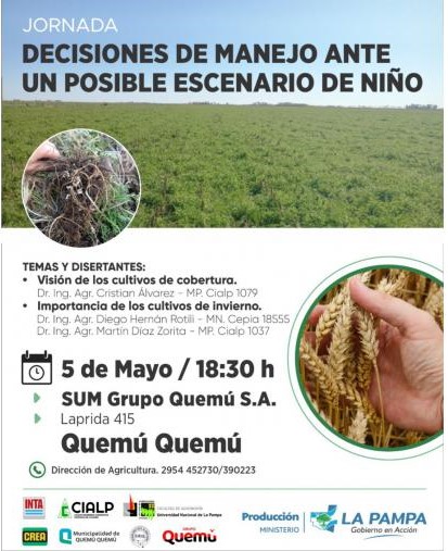Bajo el título “Decisiones de manejo ante un posible escenario de Niño”, se brindarán herramientas técnicas para productores y asesores en Quemú Quemú en una jornada del 5 de mayo.
