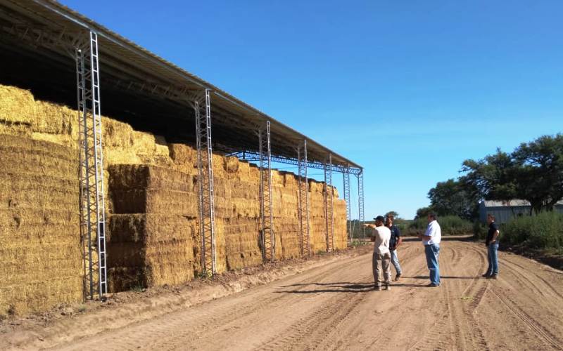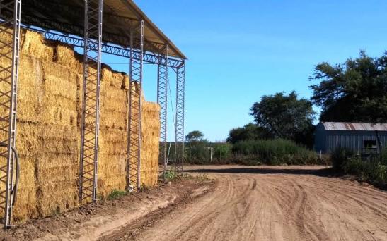 La explotación tiene tierra limosa quizás difícil de trabajar pero “interesante” en cuanto a calidad. La lluvia, en el 2018 superó el régimen normal en un 30% y había un remanente que se expresa en los rindes de los cultivos para cosechar. Allí una de las opciones productivas es la alfalfa, destinados a megafardos. Se usa una semilla variedad monarca de los grupos entre 6 y 7 con buenos resultados en la zona, obteniendo una producción de materia verde en años promedio que llega a 25 ó 27 megafardos por hectárea, equivalente a unos 10 mil kilos de materia seca anual. En el lugar logran almacenar bajo techo, con dos estructuras de mil metros cuadrados y una altura de seis metros libres cerca de cuatro mil megafardos en cada tinglado. Así se preserva lo de mejor calidad y el resto queda afuera con lonas.