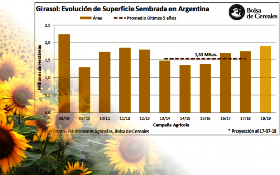 El informe sobre el cultivo, agregó que a ese crecimiento se sumarán los núcleos productivos de Buenos Aires y La Pampa donde el girasol se perfila a recuperar el área que no pudo ser implantada durante la campaña pasada por excesos hídricos. “Bajo este escenario, y de mantenerse buenas condiciones climáticas durante toda la ventana óptima de siembra, se estima que el área destinada a girasol alcanzaría las 1.900.000 hectáreas para la campaña 2018/19”. Esa suba sería un 8,6 % por encima del ciclo previo y un 24,2 % superior al promedio de las últimas cinco campañas agrícolas. Pero, el incremento estimado en 150.000 hectáreas se encuentra sujeto a la evolución de la siembra, la cual se extendería hasta fines de noviembre y principios de diciembre, momento en el cual las regiones más productivas del sur de Buenos Aires y La Pampa se encontrarán en plena actividad de implantación.