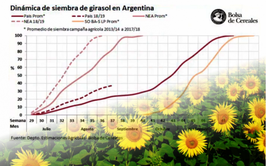 El informe agrícola semanal, según la Bolsa de Cereales, en el girasol mostró un avance del 37.1% de las 1.900.000 hectáreas a sembrar en el país. Los cuadros más adelantados, en el NEA y centro de Santa Fe están diferenciando hoja en condiciones heterogéneas de humedad.