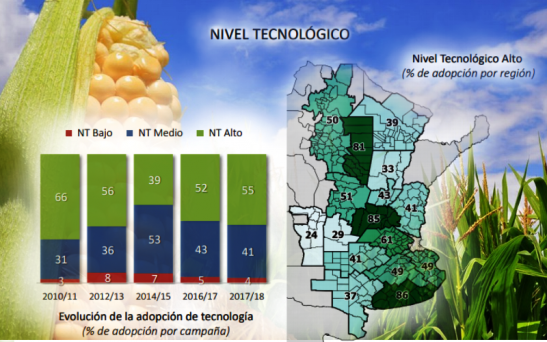 Según la BC: El maíz fue el cultivo más tecnológico en la Argentina, concentrando un 55% de su producción en Niveles Tecnológicos Altos. En la última campaña se destacaron zonas como el NEA oeste y el Sudeste de Buenos Aires por la adopción de Niveles de Tecnología Altos, además de los núcleos productivos del centro del área agrícola. El cultivo se sembró con densidades medias que variaron entre 47 mil plantas/Ha en los planteos de baja densidad del Sudoeste de Buenos Aires y 77 mil plantas/Ha en el Núcleo Norte.