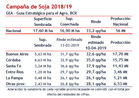 Los resultados parciales que se están obteniendo en Córdoba permiten ajustar en 35,0 qq/ha el rinde provincial de la oleaginosa. Son dos quintales más respecto a lo que se estimaba en marzo. Córdoba, que hace un año sufría el mayor recorte productivo que la dejaba por debajo de la valla de los 9 Mt, en este ciclo 2018/19 ha alcanzaría a producir 15,75 Mt de soja.