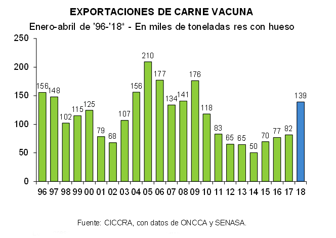 Los embarques de carne vacuna fueron los más elevados de los últimos nueve años. Y cuando se extiende el período de análisis, la recuperación gradual de las ventas en los mercados internacionales se evidencia aún más, ya que el volumen exportado en enero-marzo de 2018 ocupó el 8º lugar entre los primeros trimestres de los últimos 23 años.