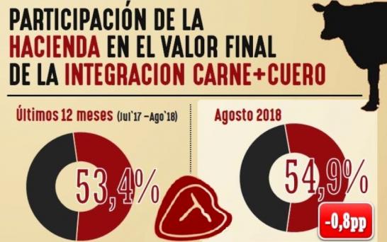 La Fundación Mediterránea dio a conocer la participación de la hacienda en el valor final de la integración carne + cuero del mes de agosto que mostró un descenso de 0.8 puntos en relación al promedio que tiene ese mes hace más de una década, totalizando en 54.9%.