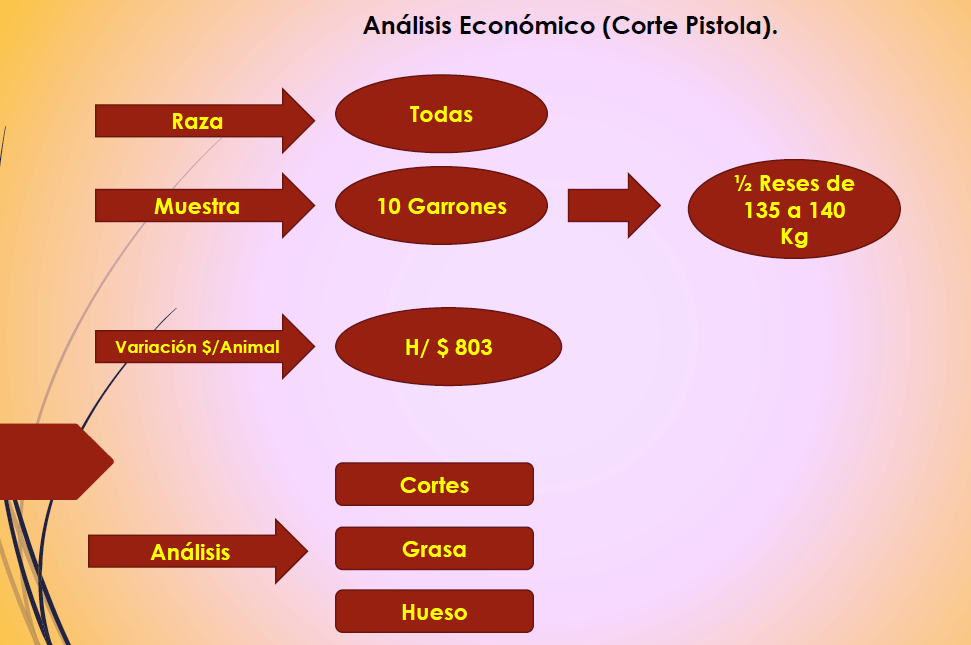 Por último, se hizo una selección sobre los 28 garrones entre los individuos con 135 a 140 kilos de media, observando así que había dos animales que daban diferente beneficio económico en su corte pistola. Por el desposte que comprende el cuarto trasero, lomo y el bife angosto, separados en los diferentes cortes de consumo de carne, en esos dos bovinos de 138 kilos había una diferencia del 10%. Ambos eran Angus dientes de leche y se vio que pese a ser de buena calidad ambos uno tuvo mejor rendimiento, eso significa que el frigorífico pagó lo mismo por la hacienda pese a que entre ambos animales la ganancia tuvo una diferencia de 800 pesos.