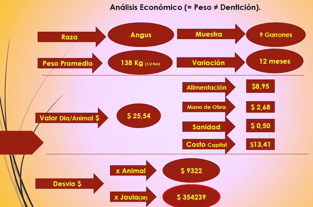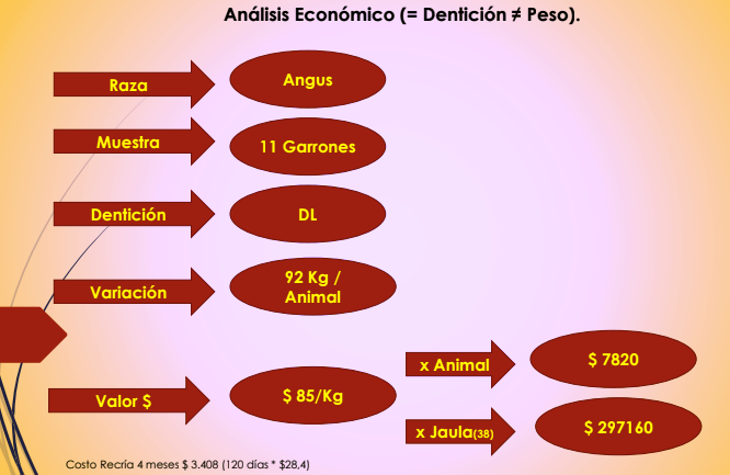 Una de las comparaciones observó animales de la misma raza y producción de carne al gancho, pero con diferente edad. Incluyó un animal con diente de leche, de hasta 18 meses, frente a otro de cuatro dientes con un año más de edad. En la relación costo- tiempo se consideró alimentación con base a pastura, mano de obra con un operario cada 500 animales, sanidad por un año, y el valor de tener el capital inmovilizado calculado como un 40% anual. Así para producir la carne se calculó que por animal que se dejó un año extra hubo un costo de 9.000 pesos.